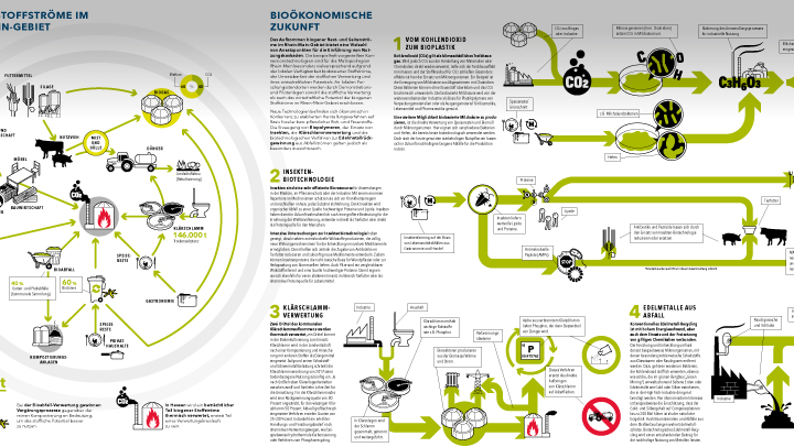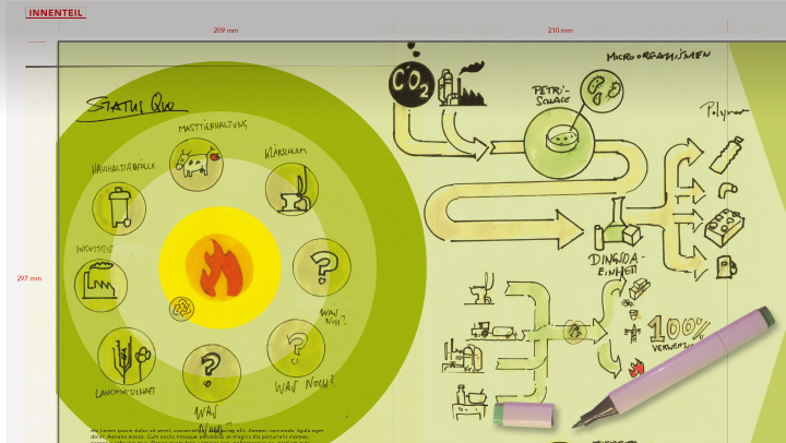 Am Anfang des Prozesses mussten wir uns allerdings erstmal mit dem Thema BIOÖKONOMIE und den darzustellenden Aufgaben beschäftigen. Grundlage hierzu wahren mehrere wissenschaftliche Studien, die es galt, durchzuarbeiten. Mit deren Hilfe erstellten wir Mind-Map-artige Strukturen, die unser Verständnis für das komplexe Thema schulte.