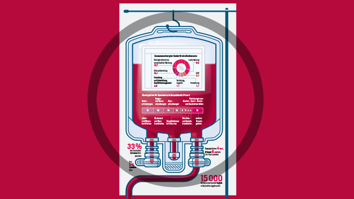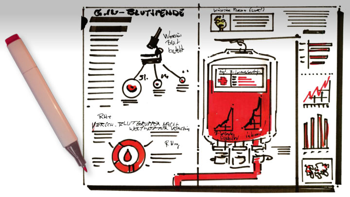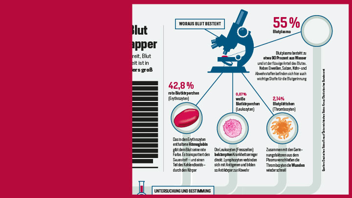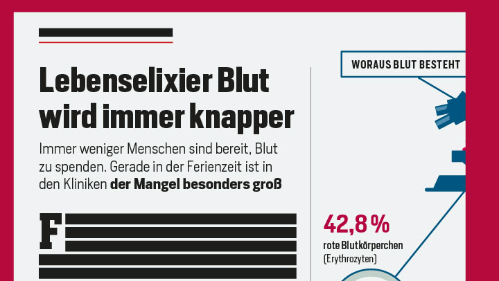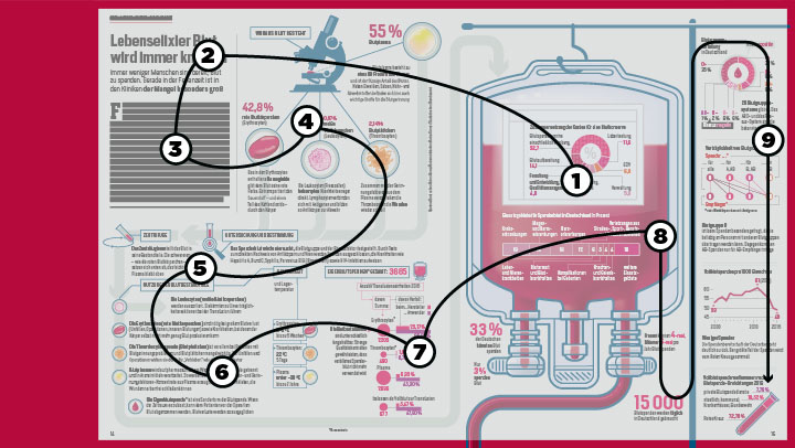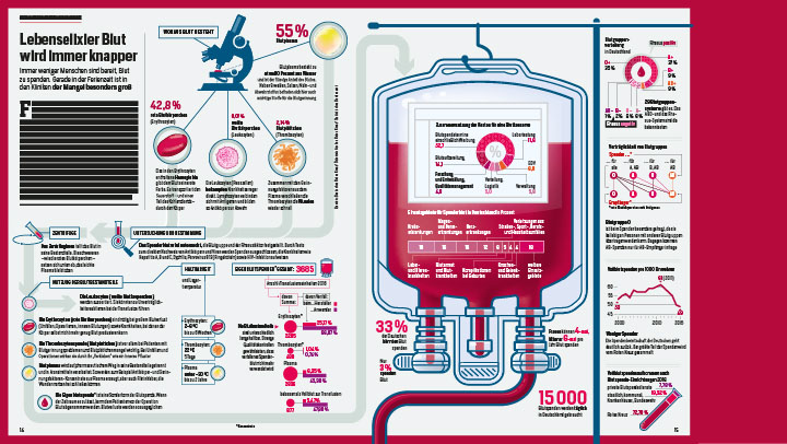 Und so sah die gedruckte Grafik dann aus. Das Thema Blut und Blutspende ist sehr komplex. Wir waren der Meinung, dass wir auch so viel wichtige Information wie möglich darstellen sollten. Gleichzeitig mussten wir eine Form finden, die ATTRAKTIV genug ist, dass sich der Leser damit auch beschäftigt.